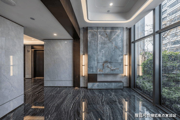 虹桥嘉悦府借鉴国际豪宅灵感,定制卡塔青玉岩板、鱼肚灰石材拉槽造型、门套、古铜色不锈钢饰面,配以大规格云纹地砖和悬浮吊顶,打造高配入户大堂,以专属的优雅艺术品位彰显贵气。