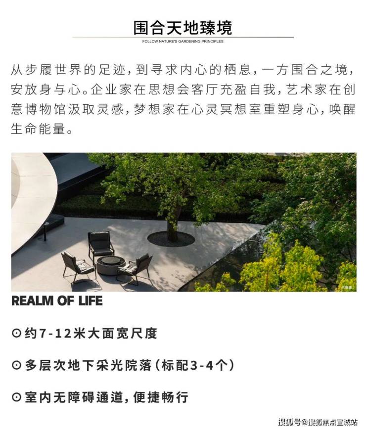 设计师以三面建筑和一面围墙,四合成内聚型的景观空间,庭院居于其中,成为建筑各房间的视线焦点。每户均有80至100平方米的开放式内庭院,宅在院中,宅院合一,天地共生,天人合一。每户地下层面均有3处花园式采光天井,保证了地下空间的舒适通透。