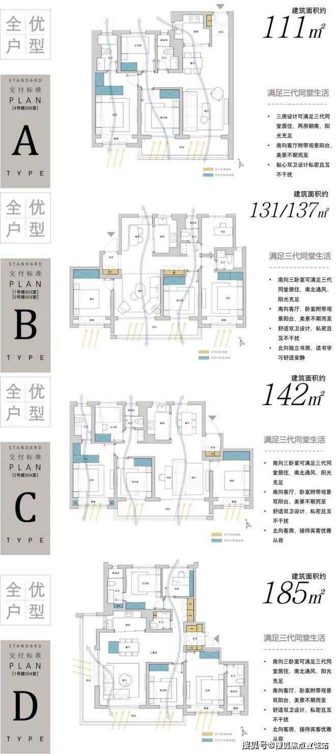 户型细节:111㎡三房两厅两卫,三开间朝南且南北通透,LDKB 一体化设计搭配南向双联阳台,主卧为套房设计;131/137㎡四房两厅两卫,四开间朝南,大面宽短进深,主卧套房带独立卫浴;142㎡四房两厅两卫,拥有大客厅和双联大阳台,三卧朝南,采光条件优越;185㎡四房两厅三卫,采用端厅设计,配有 270° 转角大阳台,且为双套房设计。
