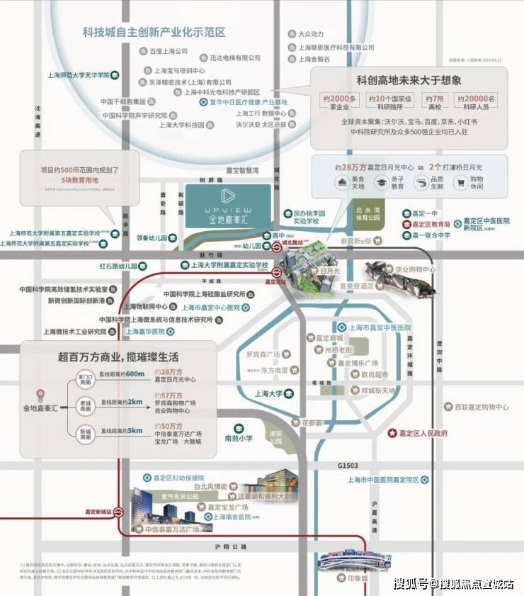 金地·嘉峯汇于嘉定新城发展主脉之上,是目前上海唯一国家中科院聚集区,紧邻嘉定区“十四五”规划中的三个样板示范区之一的嘉宝智慧湾(在建)。汇聚约10个国家级科研院所、约7所高校、约20000名科研人员,北侧更有小红书、京东、百度、联影医疗等500强企业,未来潜力十足。