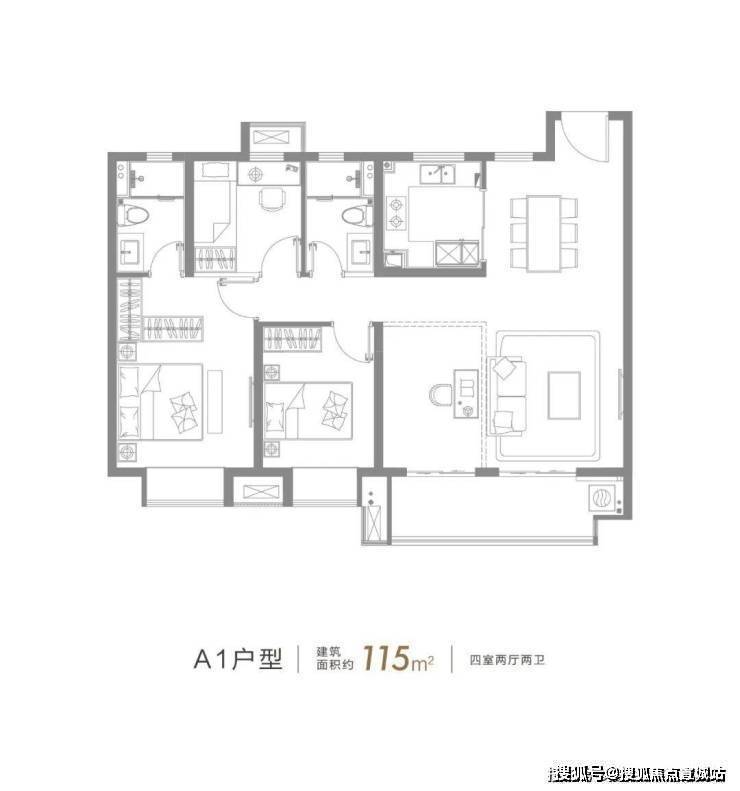 建面约115㎡的4房2厅2卫户型,超大面宽南向阳台、整体南北通透、主卧套房的设计,这个户型实现了多数人对于未来生活的期待。