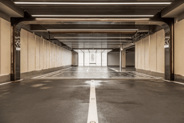 2.高定地库:宽绰坡道嵌入光序灯带,尊崇迎归礼序;环氧地坪,匠艺选材,颜值与品质兼具
