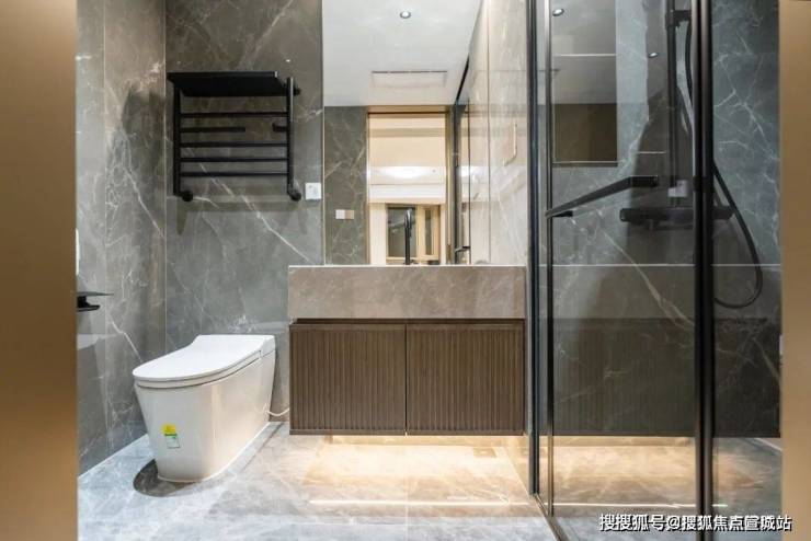 卫浴空间打造也是满满的豪宅品质感,卫生间均配备了 智能马桶和 电加热毛巾架、淋浴房、花洒均是科勒精选系列,主卫为香槟金色,细微之处见真章!