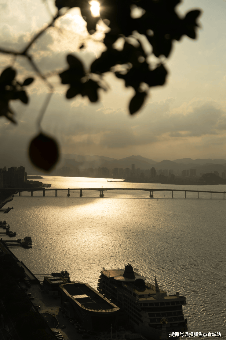 中段用浪白与夕阳金勾勒出270°江景画框;