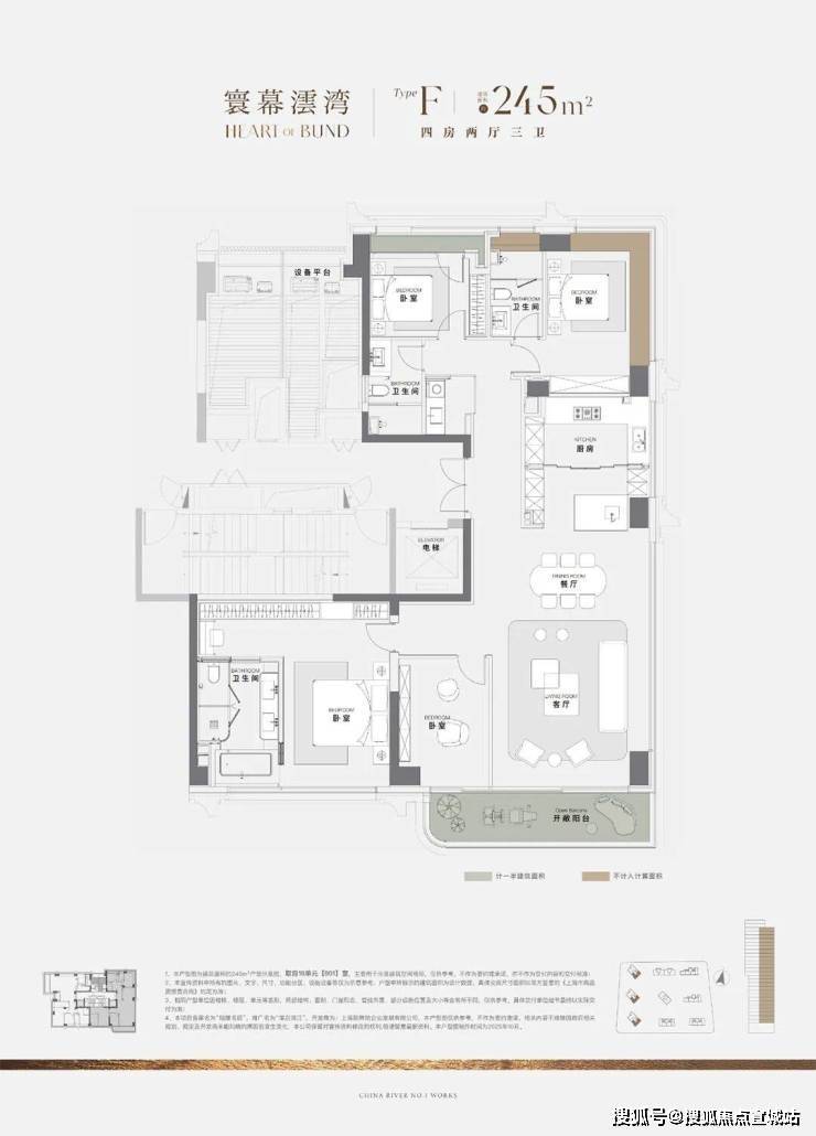 户型设计:建面245㎡主力户型由吴滨工作室设计,采用270°环幕观江设计,8.5米超大面宽客厅彰显空间尺度