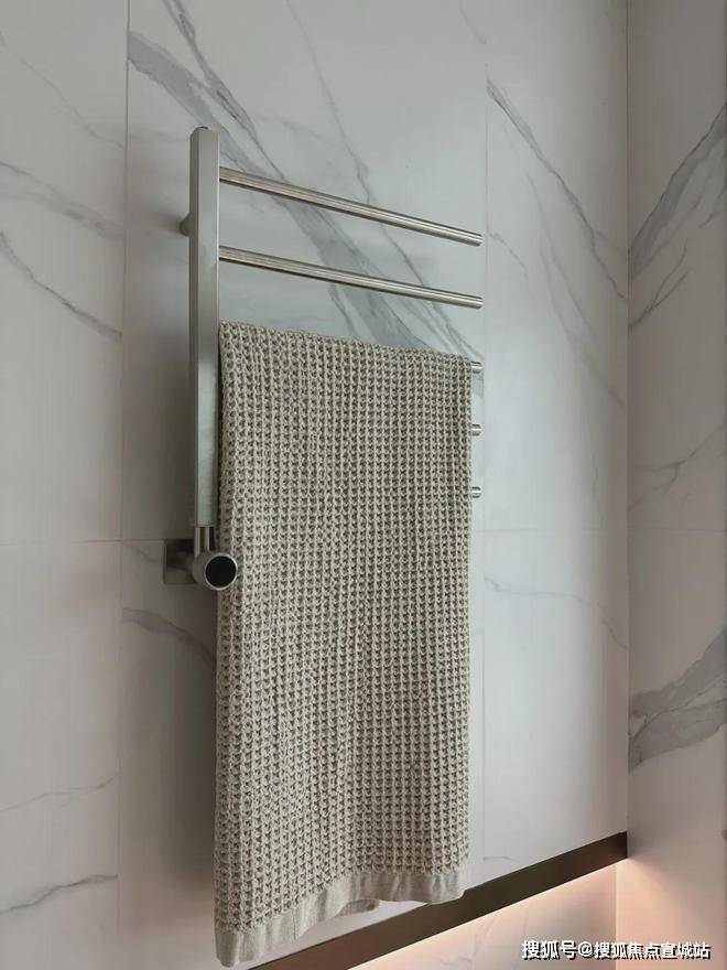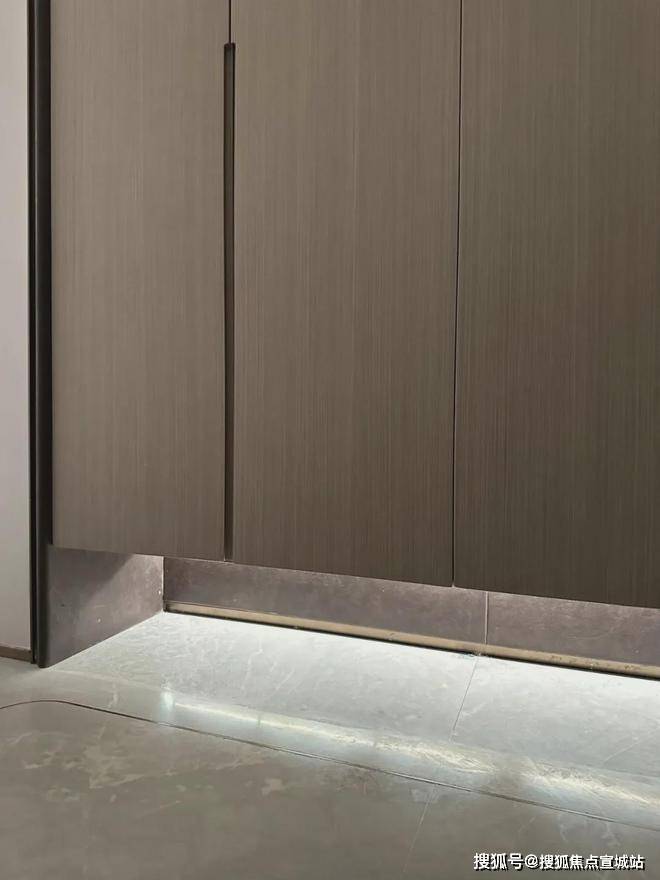 这个是入户玄关处的地面,大理石地面搭配金属线条勾勒出玄关地界,归家的氛围感从这个区域就开始了~这还不是重点,玄关座椅背后,是一面皮革包裹的墙面。鞋柜下方做了悬浮处理,同样也是内嵌灯带,这里灯光的角度还会再调整,因为灯光映射在大理石地面上,要显得尽量柔和不刺眼;同时,鞋柜下方可放拖鞋,还能放扫地机器人,便于日常清扫打理。鞋柜的饰面,纹路方向统一,呈现出极强的协调感。橱柜作为强功能性的收纳系统,自然少不了操作性能上的考究,吊柜做了升降式的拉篮,以后再也不用爬上高凳拿取了。下方的橱柜则做了转角拉篮,充分利用转角空间,使物品井然有序的同时,轻松方便取放。水槽也是一个大单槽,放得下炒锅汤锅这种大物件~抽拉式龙头,清洗大水槽的时候很方便,360度旋转伸展自如,这款弯管还是硅胶材质,柔软耐用有弹性,还可切换出水模式,出来的水柱也是很柔和细腻不飞溅。厨房玻璃门是上轨道移门,意味着地面部分没有任何轨道,不会有灰尘积攒,炒菜时关上,避免油烟散入室内;平时拉开,可以扩充室内视觉感受。卫浴缦云上海所有户型的所有卫生间里都用了悬浮式的洁具和柜体,确保了下方空间的打扫无死角,对未来的入住带来非常大的便利性!吉博力同层排水技术,静音是最大亮点;特制“水母”地漏,多重防臭防反溢。干净舒适的卫生间,是从空气到水流的全面把控~你们可以看下缦云上海是如何处理卫生间木门的防潮的——卫生间一侧用大理石做踢脚线,这是真正细致入微的巧思!主卧卫生间配备的电热毛巾架简直就是遇到潮冷节气的“福音”,让毛巾、内衣都能够提前加热干燥。层高对于缦云上海的纯大宅社区定位,能买这样产品的购房者会非常在意空间感。缦云上海全部户型层高约3.3米,室内所有空间的门都做了通顶设计,更阔绰的居室空间,将生活格局有效放大,通风、采光和观景体验的全方位提升!弧形元素缦云上海样板间里随处可见柔和的圆弧修饰,特别是柜体、墙体包边的圆弧转角,在进出各个空间时,减少磕碰的风险,对于有孩子和老人的家庭来说,是非常实用的友好设计。而且,门套做了弧形设计后,还叠加了金属线与墙纸做了分割,加强隔断界限感,提升室内家居精致度~比起中规中矩的直线,弧形施工工艺更复杂、造价更高,却多了几分灵动轻盈!这种弧形的元素不只是在样板间里,在售楼处也能经常看到,比如电梯厅。
