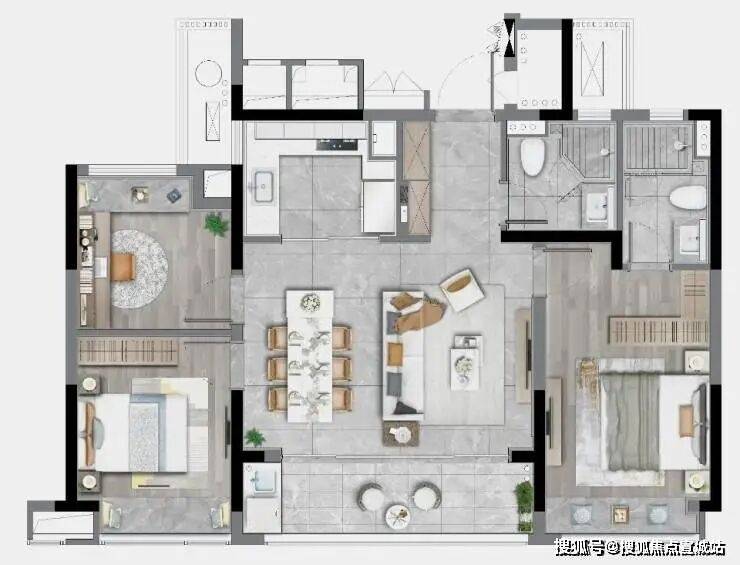 99㎡三房两卫,99㎡厅,连上外接的南向大阳台,形成了一个尺度感超强的公区。主卧除了自带的飘窗和独卫,甚至还预留了一个走入式衣帽间的空间。