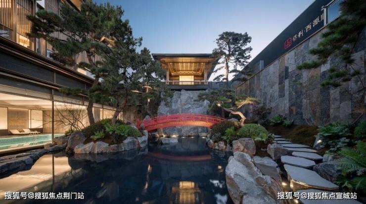 假山、叠水、屏风、叠瀑之下架一座小桥,假山依水,风水上佳,你可以在大落地窗的会所里倚窗观景。