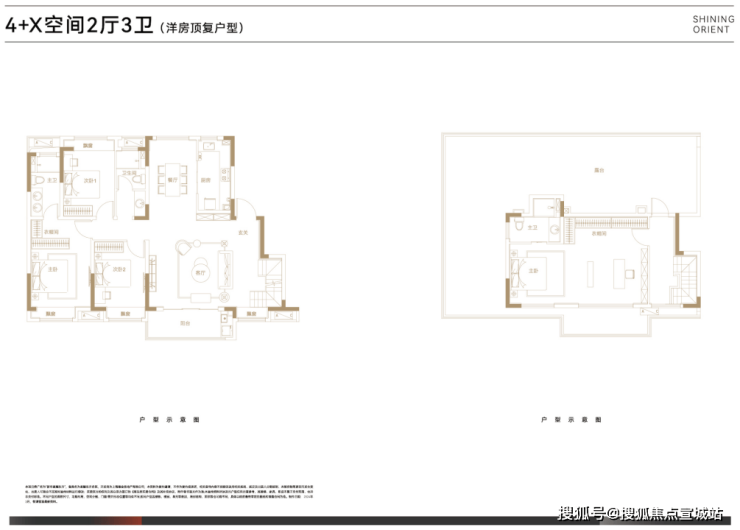 叠墅总高四层,设计了邻里空间,单元门设计也是非常的大气。上叠125㎡三房两厅三卫,顶楼闷顶层等可以拓展空间;下叠140㎡四房两厅三卫,另有超宽裕的赠送面积。