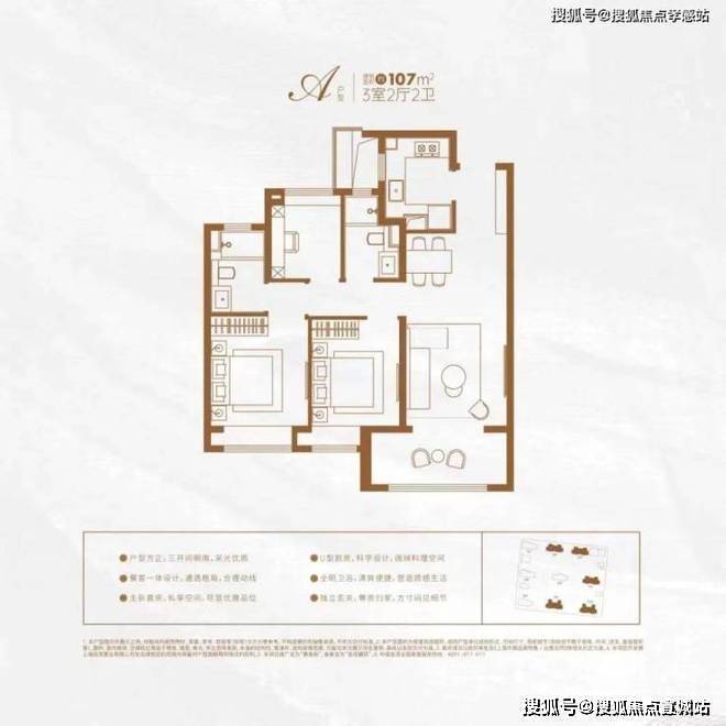 建面约107㎡三房的户型,三开间朝南,大面宽阳台,餐客厅一体,还有精细化收纳体系,人性化细