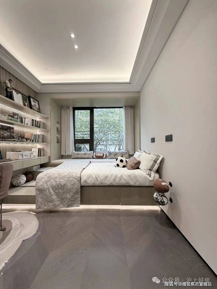 其中主卧的270°转角飘窗就有约5.7m²,通过与外立面的结合,直接做了梳妆台和储物柜,拓展了飘窗的实用性。