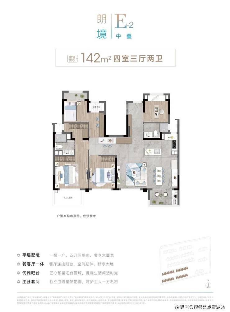 该户型不仅保留了三开间朝南和餐客厅一体化的优势。更在尺度上大踏步进阶,尤其主卧贯穿南北,套房设计,居住舒适度可圈可点。