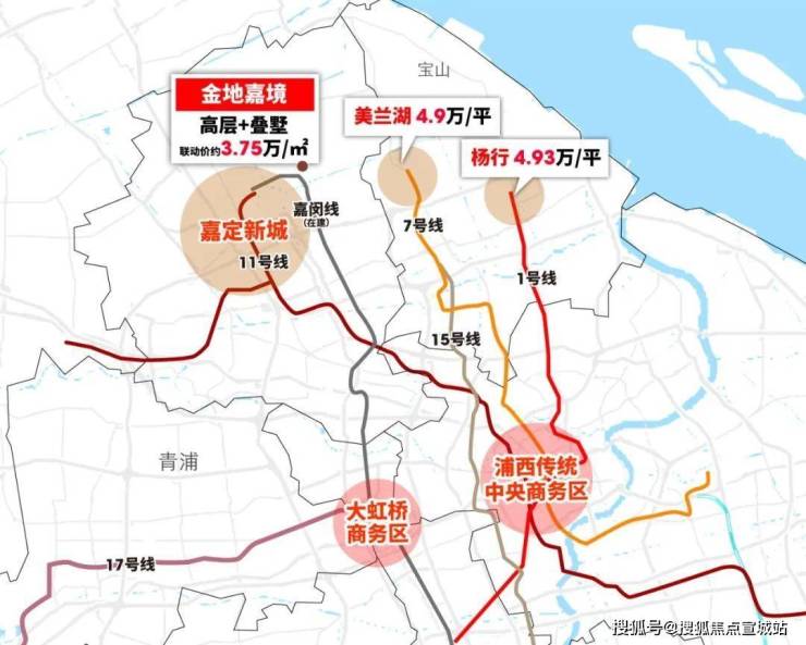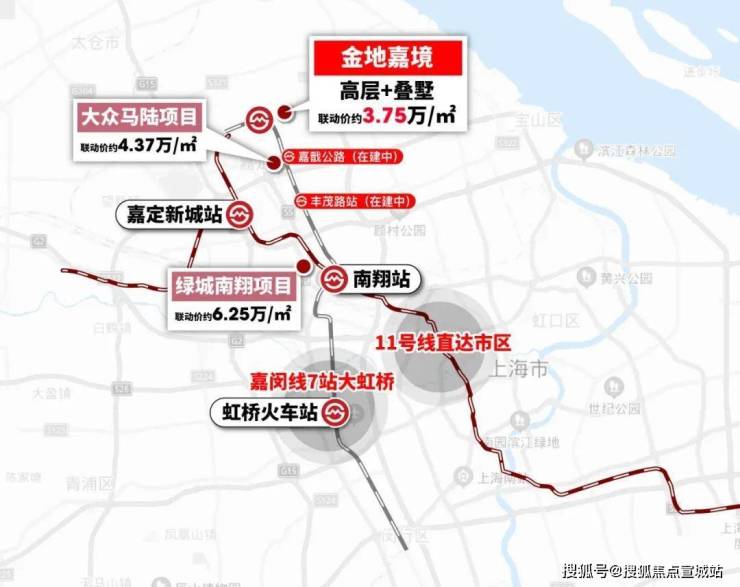 聚焦嘉闵线(在建中)本身,与金地嘉境1站之隔的嘉戬公路站(在建中)旁的大众马陆项目,联动价4.37万/㎡;与金地嘉境3站之隔的南翔站旁的绿地南翔项目,联动价6.25万/㎡。