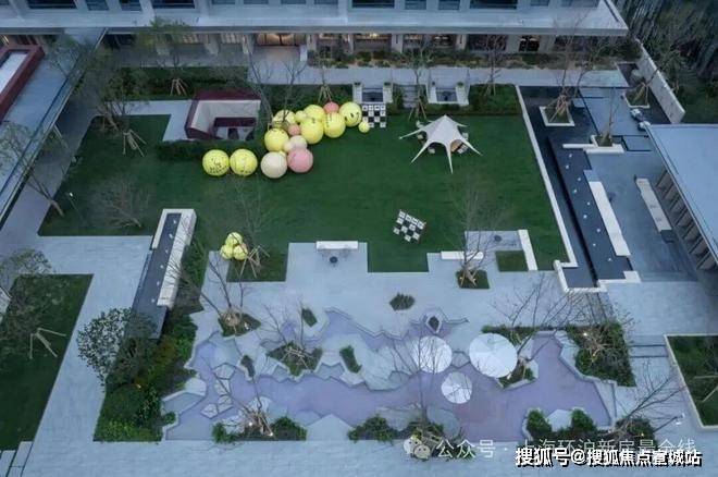 阳光草坪,大面积的平坦开敞绿地塑造了舒适平和的氛围,小朋友可以日常在这里跑跑跳跳释放天性,周末时可以铺上餐布,搭起帐篷来一次露营。