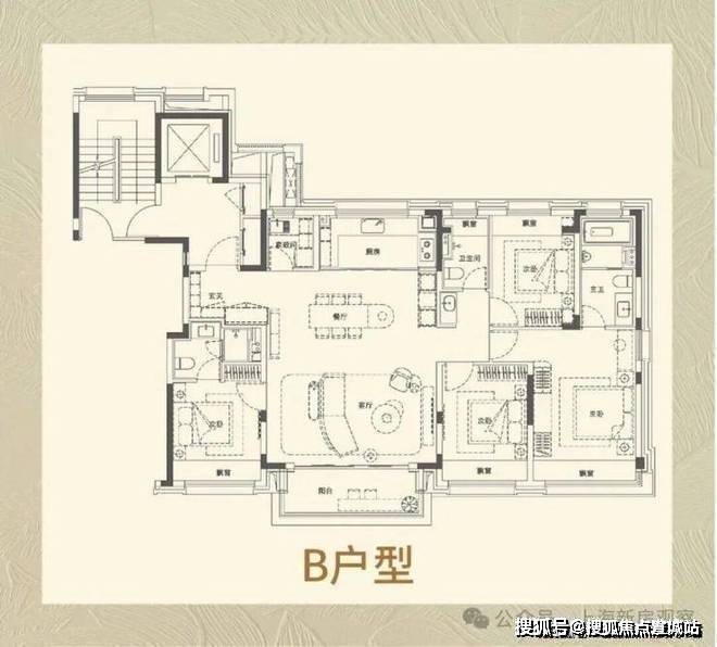 除了A户型,184的B户型则非常符合传统认知:经典的南北向,标准的超大面宽、短进深,克服了市区很多新房由于受地块限制,在设计时总是有一些空间不能尽如人意的弊端,四个空间朝南一定排开,全屋全明设计,没有死角,无论是空间感还是动线都很符合对户型要求较高的买家的需求。