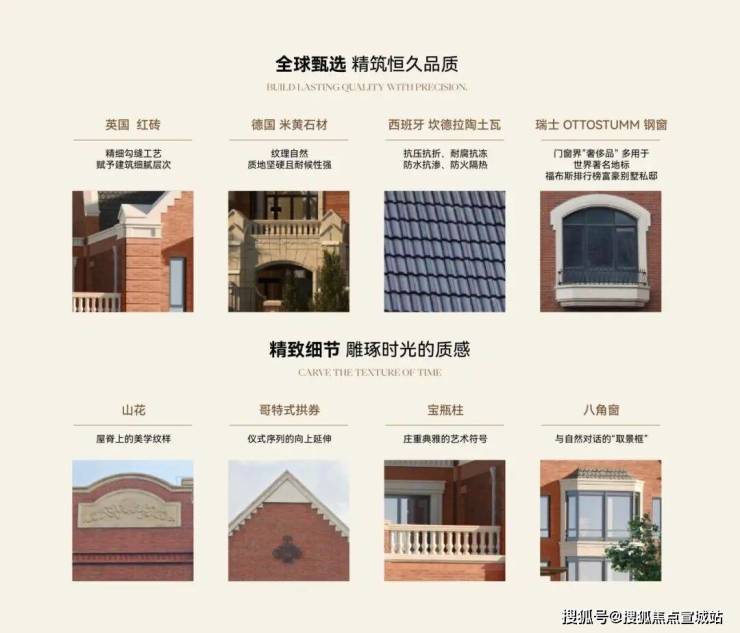材料上甄选英国、德国、西班牙、瑞士等多国进口材料,红砖采用精细勾缝工艺,石材、屋面材料经久耐用,同源上海檀宫的瑞士OTTOSTUMM钢窗等优质建材,打造历久弥新的建筑。