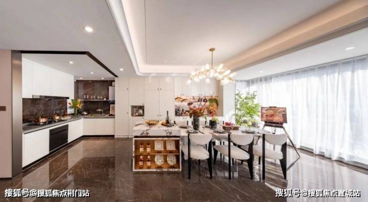 玄关层即公区层,约6.9米面宽的餐客厅+茶歇区+环U厨房,办个私家派对不在话下。往下走是卧室层,有长者套房和二孩双卧。