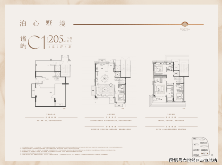 户型特点:下叠边套,南向面宽约9米,客餐厅同宽约5.8米,空间开阔。一楼设南向卧室,采光好且视野佳。二楼为三套房+主卧总统套房设计,主卫南向,可容纳浴缸和双台盆。地下室方正,附赠采光井,利用率高。