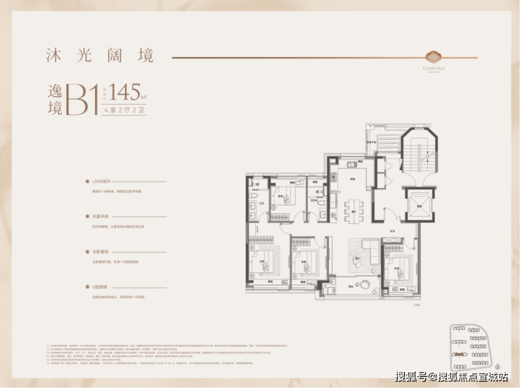 户型特点:4开间朝南,LDK一体化设计,南北通透。客厅面宽达4.3米,外接4.8米长阳台,采光通风俱佳。主卧带270°转角飘窗,主卫也有飘窗赠送。全屋飘窗设计,独立电梯厅,私密性与尊享感强。