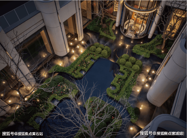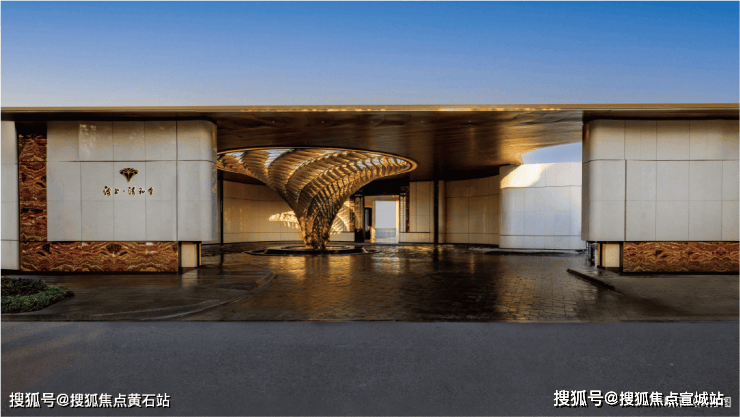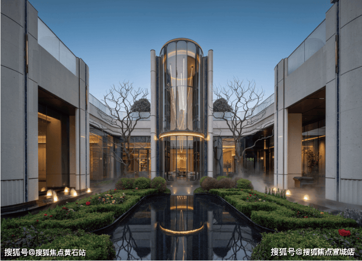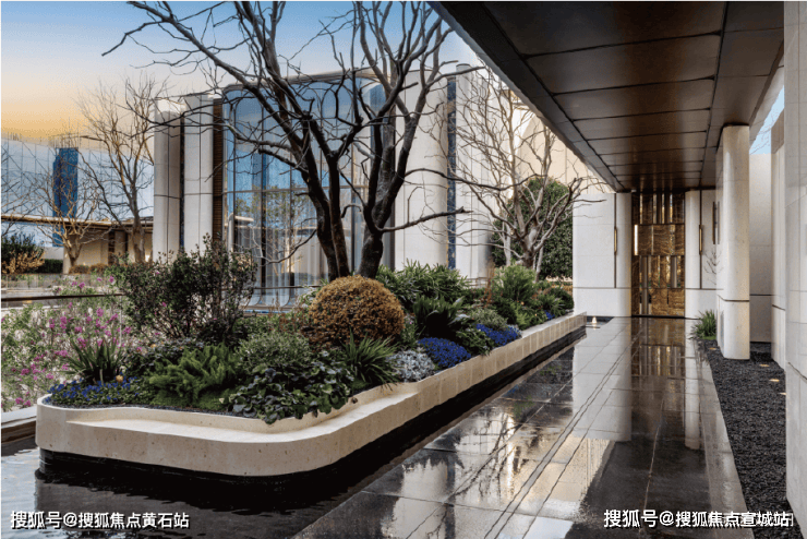 考究《周礼·考工记》古代规格定制“面阔九间”归家门庭,门庭外立面采用雅奢温润的建筑材料,辅以两侧具有仪式感的跳泉水景,共同构成了“贵雅清和”的城市界面。
