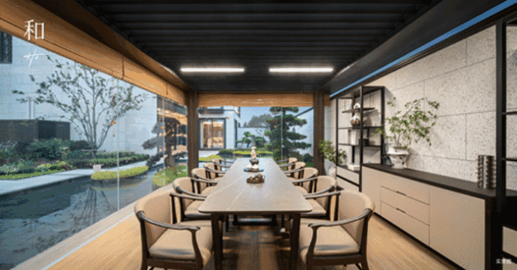 浅色石材的外立面上盖日式合瓦屋面,搭配深色金属构件,使得色彩构成冷暖有机结合,典雅简约,呈现出有时代气息的新中式建筑。歇山、硬山和小披檐等手法,丰富了建筑造型与建筑空间,与周围依山傍水的环境完美融合,组成了一幅幅画家笔下江南水乡静谧风雅的生活画卷。