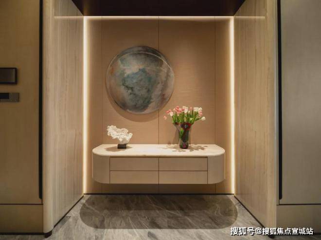 这是一套五房四卫的设计。步入玄关,大面积的直纹白玉和铜丝皮革组成的玄关背景,搭配富有禅意的软装和灯光,组成一幅绝美的3D壁画。玉石自然价值不菲,这个铜丝皮革用的是人工编织的铜丝,手感顺滑,当然它的价格也矜贵,光这幅背景就要近十万元。