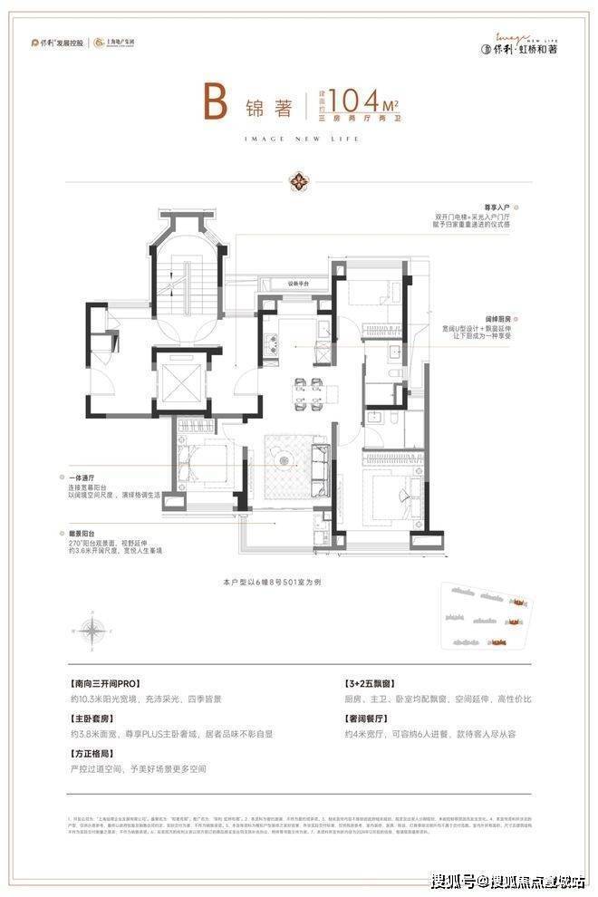 104㎡的舒适三房设计,飞机户型的空间排布,空间充裕但不浪费,将每一平米更大化利用,家人居住也互不干扰;南向面宽达10.3米,通风好采光佳;客餐厅空间足够容纳六人餐桌,再搭配玄关柜、餐边柜、橱柜、镜柜等多重收纳空间,大大提升居住的舒适性。除此以外,5大飘窗+宽景阳台+6-8平的入户门厅这一套组合下来,室内空间大大延伸和拓展,居住的舒适性直接拉满,简直不要太划算!