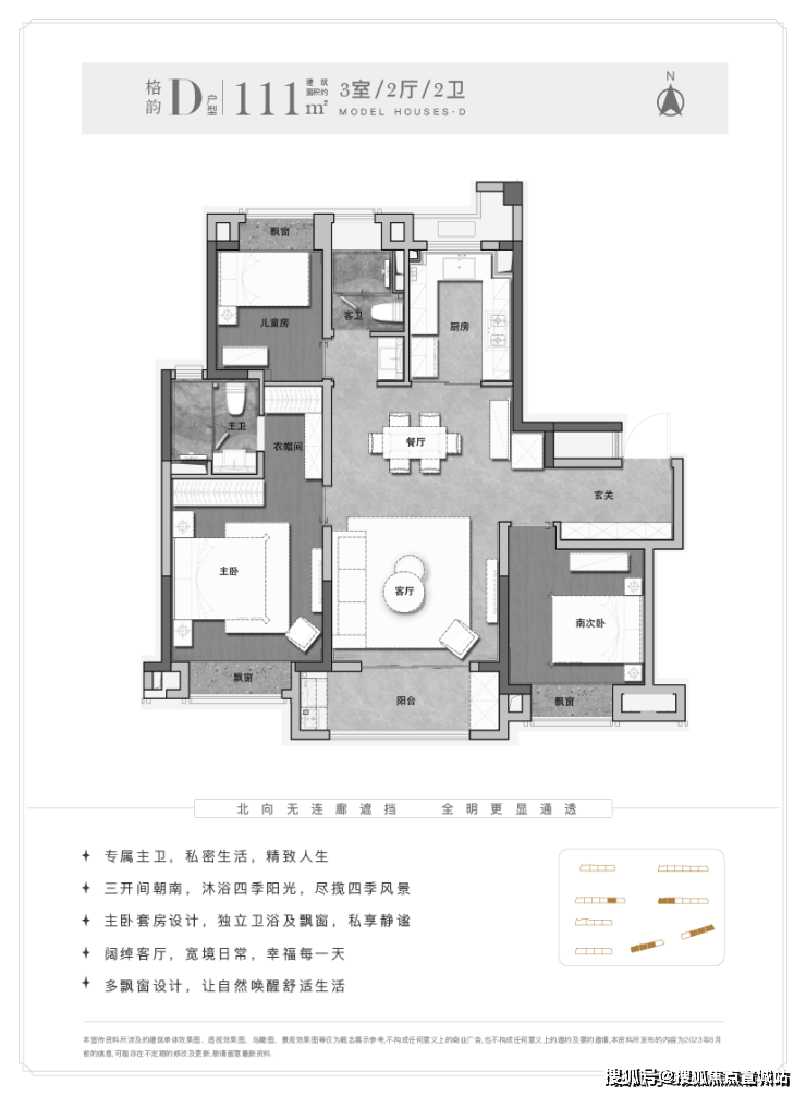 且客厅-餐厅-阳台-厨房一线连通,能真正实现南北通透。