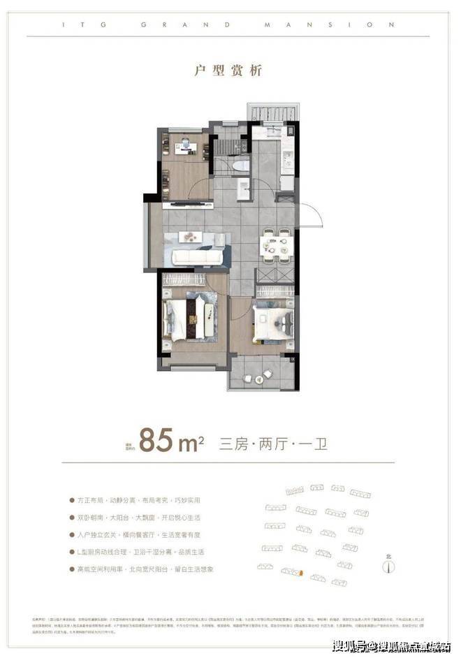 户型解析:约85㎡的3房,这种入门级的产品也要保证居住的尺度感。比如利用L形厨房与餐厅相连接,一体化的设计让空间充足利用。比如次卧连接阳台,就是人性化考虑到给他们一个私密的追光天地。