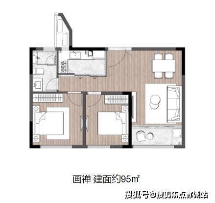 95㎡户型:为 2 室 2 厅 1 卫设计,1 梯 2 户,配有电梯等待厅,三开间朝南,通透厨房通达双厅,动静分离。