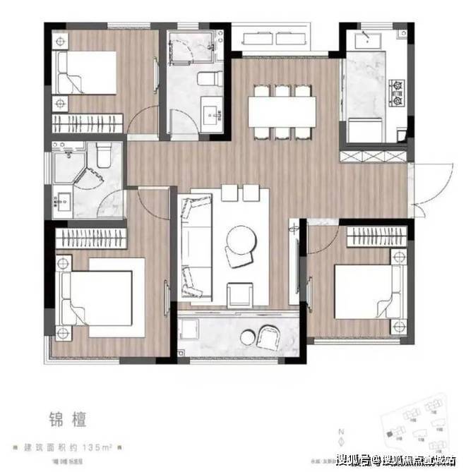 120㎡户型:是 3 室 2 厅 2 卫布局,1 梯 2 户,配有电梯等待厅,正南正北,约 3m 层高,三开间朝南,主卧为温馨套房,与 L 型窗景联合。