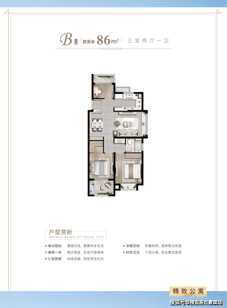 建面约86㎡3房2厅1卫户型特点:做到了双开间朝南+双阳台设计+卫生间干湿分离,一个非常紧凑的小3房户型。
