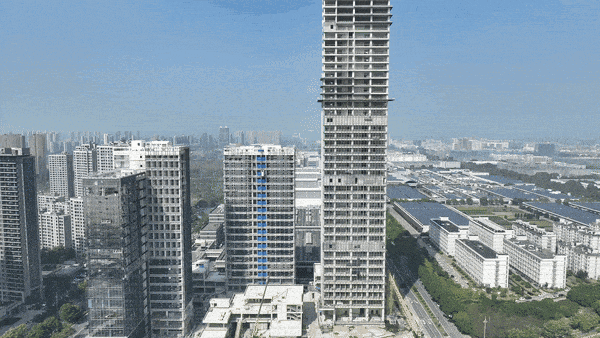 针对建筑造型特点,绿城·钱塘之门从项目施工成本、结构适用性、安全角度出发,选用液压爬模体系、附着式智能升降脚手架工艺,施工时通过提升,灵活调整单元式导轨挂座,解决了防护屏的角度变换、俯仰爬升、无支撑点爬升辅助以及跃层爬升等难题,实现立面轮廓超高层建筑的高空安全施工。同时超高层主体施工采用高强混凝土泵送技术及大体积混凝土分层浇筑工艺,通过全流程细节把控与工艺革新,实现施工效率提升30%、高空作业风险降低50%,系统性构建高效安全的建造体系。