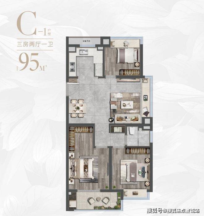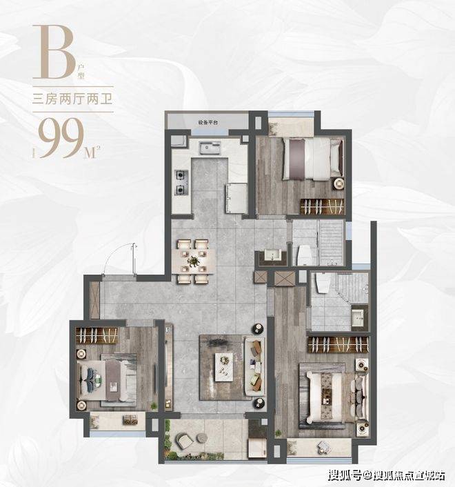 主力户型:有 88㎡三房两厅一卫、95㎡三房两厅一卫、99㎡三房两厅两卫和 133㎡四房两厅两卫。