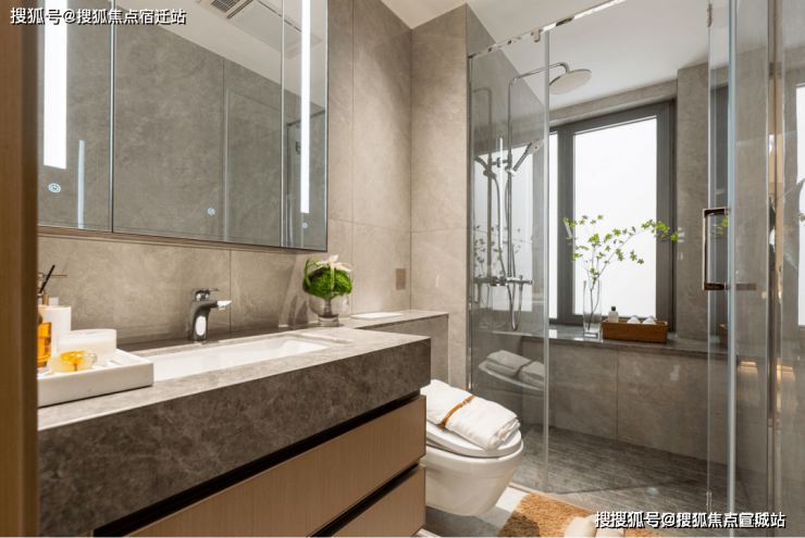 细节相当多,再提一点,卫生间台面都选用天然石材,触感光滑、厚重.