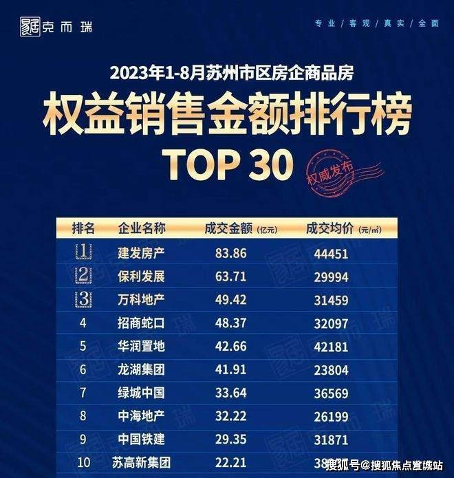 2023年1-8月, 建发房产以83.86亿夺得苏州市区房企商品房权益销售金额TOP1,遥遥领先。