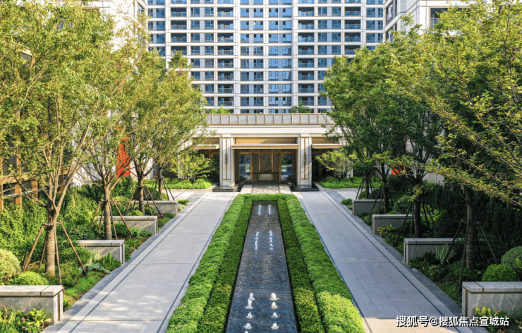 入口中轴对称式的前厅水景,两侧阵列由榉树围合组成,不仅拥有“门前中举”的美好寓意,也让入口的仪式感拉满,与灵动的喷泉水景交相辉映,形成具有东方礼序的归家体验。