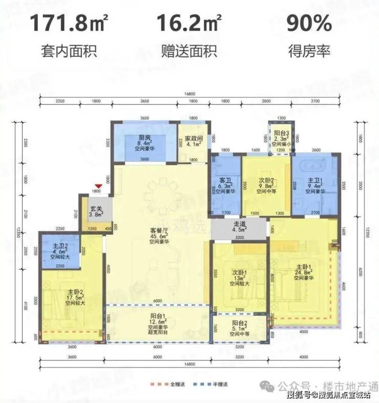 170㎡,4开间超南面宽达15.7米;餐客厅面积达到44个平方米;厨房开间达到4.35米。