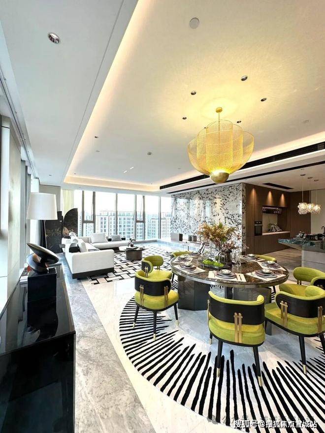 大堂的仪式感营造:项目入户大堂挑高 5.8 米,售楼处复刻了大堂的 “石材地面拼花”—— 以 “江湾水流” 为灵感,用意大利灰石与白玉兰石材拼接出蜿蜒的 “水纹”,搭配定制的水晶吊灯(形似 “水滴串联”),让 “归家” 成为一场仪式;