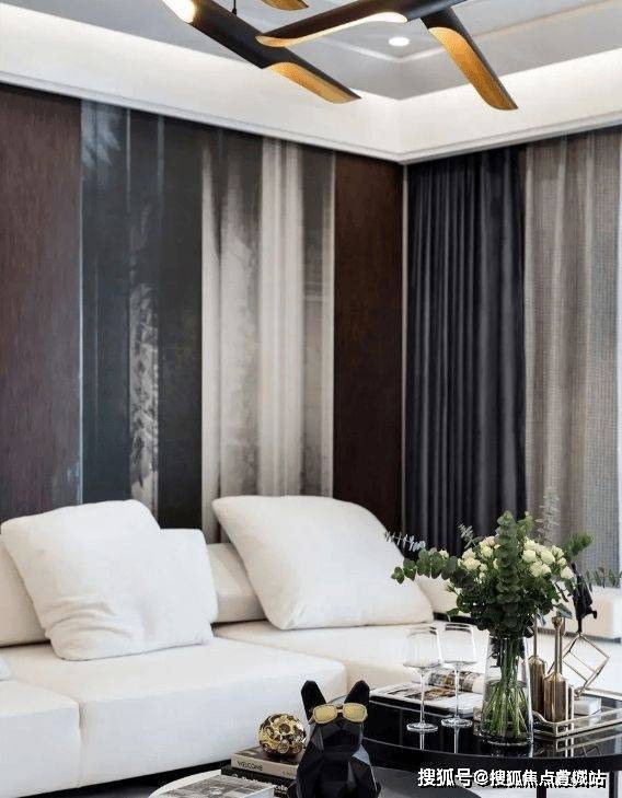 客厅设计简洁明亮,通透大气。无主灯的吊顶,结合白色的家具,上下呼应,和谐统一。深色的背景墙,给空间注入了一股摩登的氛围,造型独特的吊灯,彰显个性的空间氛围。