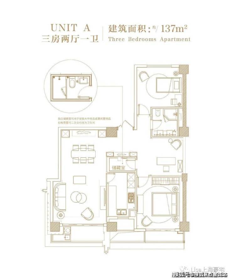 独立储藏室可用于安放大件物品或是闲置物品,如有需要可二次交付改为卫生间。