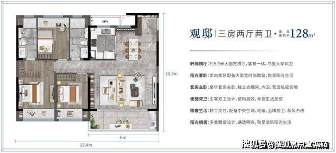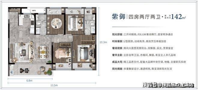 精研建筑面积约108-142㎡全明户型,全屋大飘窗、宽景大阳台、南向大开间、私密主卧套,空间实用与美观兼备,超高得房率与附加值,满足多样家庭功能需求