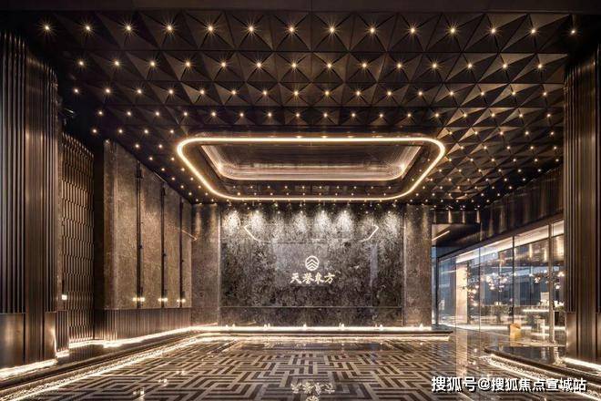 单元门甄选名贵石材搭配香槟金铝板,天誉东方售楼处电话☎:400-838-5958【预约☎】入户大堂精选翡翠绿岩板,顶部3D圆弧吊顶,一路星光温暖业主回家的路。