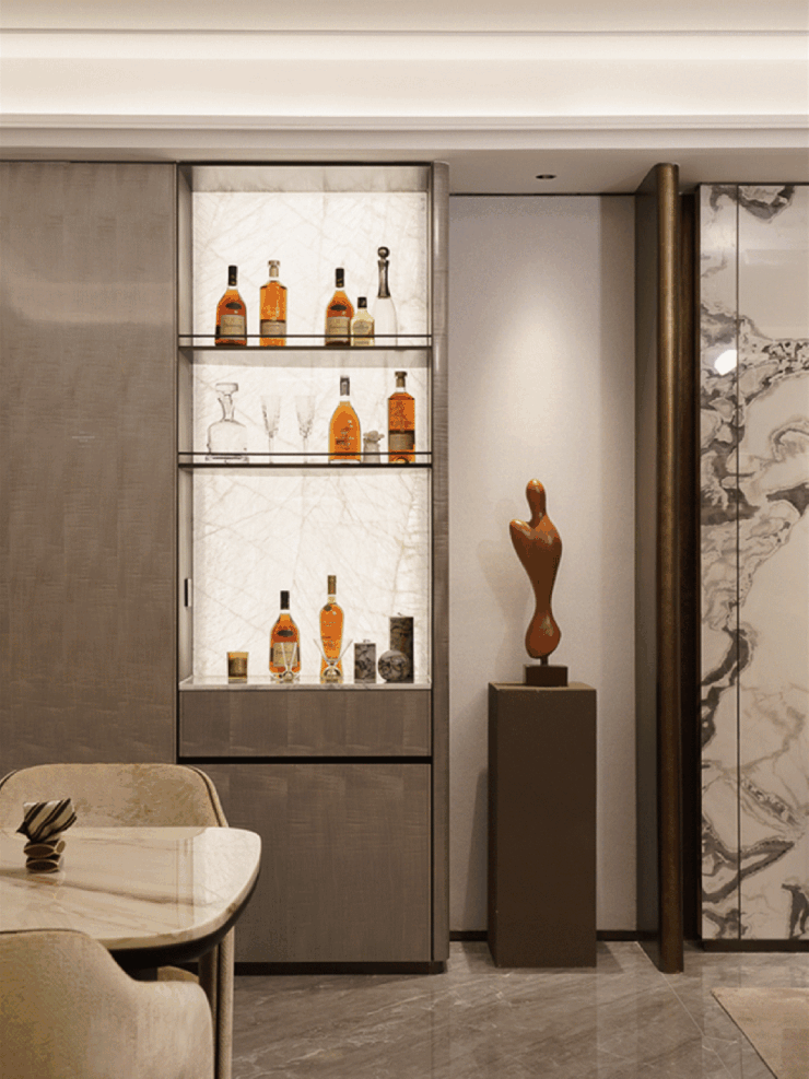 145平的大户型,入户就是一组800库,约80厘米进深的储藏空间。酒柜以及对面转角处的一套餐边柜,也是交付标准。