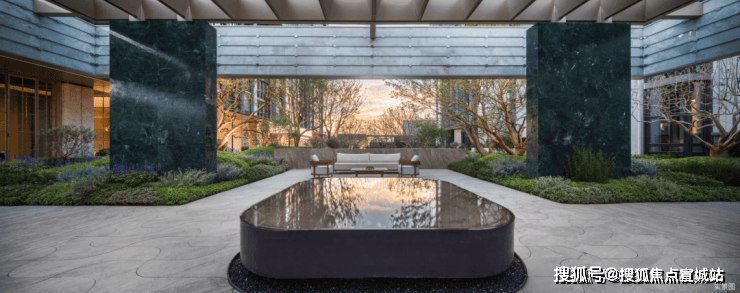 庭院中遍布着睡莲,从这里往出去像一幅画,高低层次的叠水景观,超大型的原石,还有私密的谈话空间,舒适惬意。