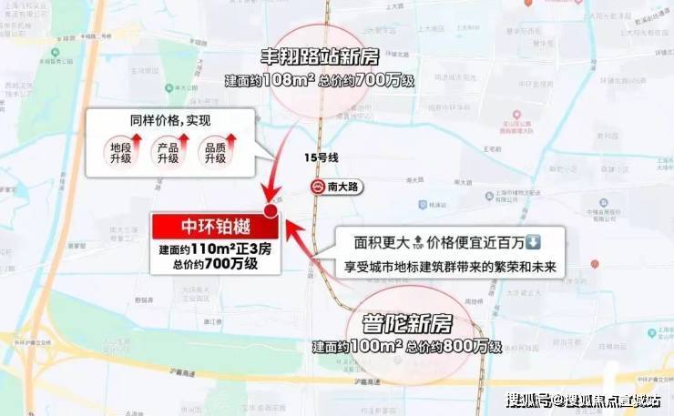 同样是地铁房,往前一站的桃浦百平三房,已经是800万级,「中环铂樾」首开66000元/平的惊喜均价,总价约700万+,同样是三房产品,劲省100-200万!