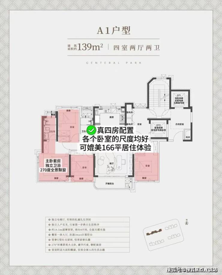 中环铂樾建面约139㎡的户型(西边套),独立电梯厅+罕见的大横厅设计,大面宽短进深,约15.05m的南向奢阔面宽,无论是采光感、尺度性都拉到了极致,享受城央豪宅级别的采光。