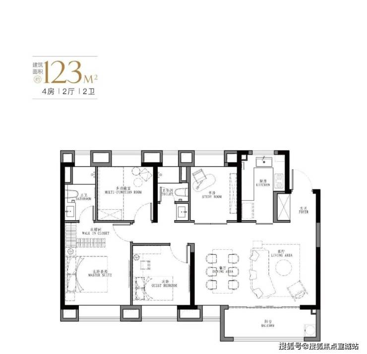 产品:103㎡、107㎡的三房两厅两卫及123㎡、129㎡的四房两厅两卫
