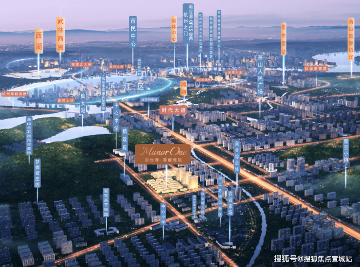 纯正法式院墅离尘不离城—从「宇宙中心」世纪城出发,沿着早已贯通的时代高架,开车不过五六首歌的时间,即可抵达菲郦雅院。随着杭州快速路网的通达提升,空间的隔阂逐渐消解。滨江核心、钱江新城等城市中心,不过都在菲郦雅院约半小时交通生活圈内。项目区位鸟瞰图