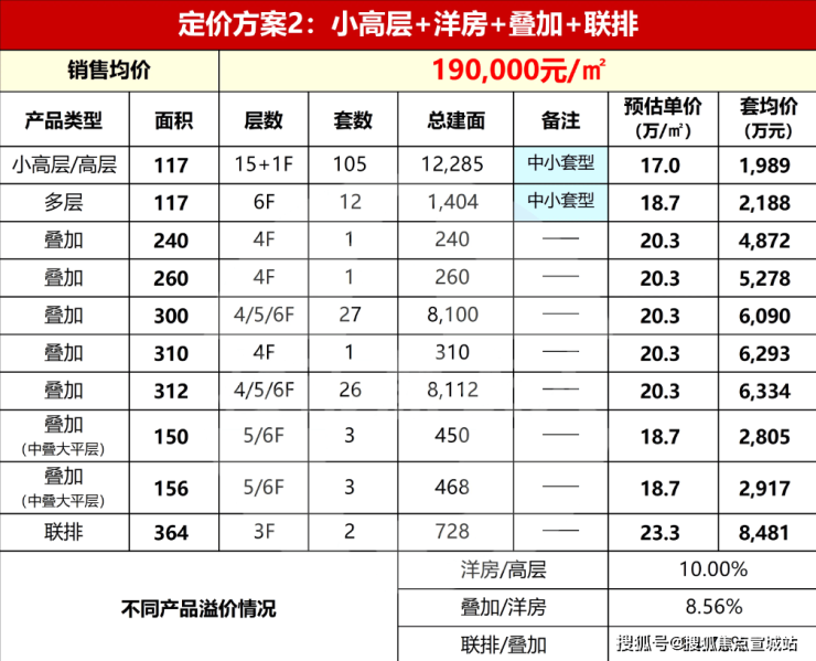 方案二:均价19万/㎡(核心户型单价微涨,联排突破23万/㎡,稀缺产品溢价约5%-8%)